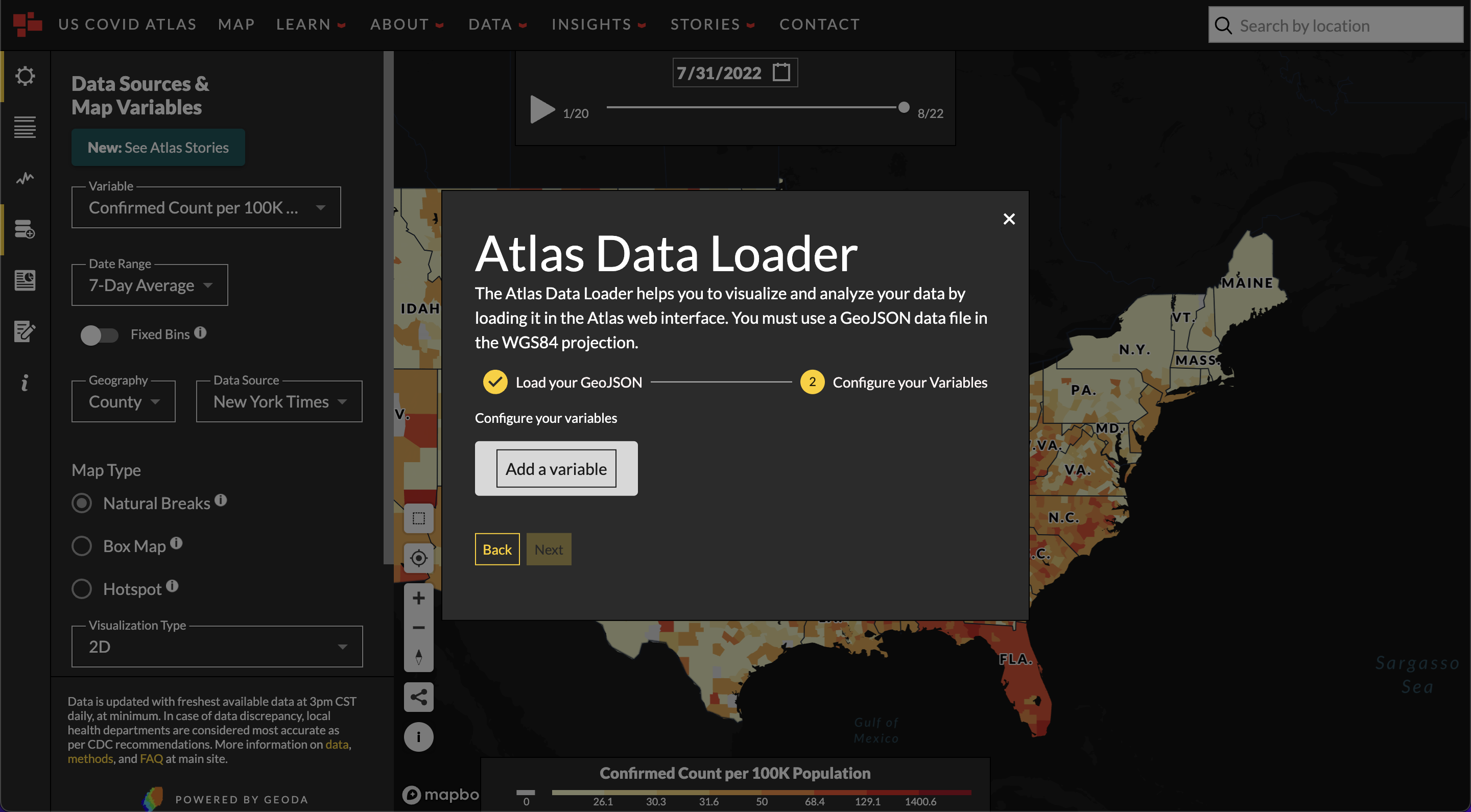 Once the joined data is downloaded onto your computer, navigate back to uscovidatlas.org/map to load it into the Atlas.