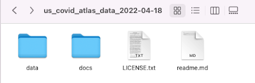 Unzip the folder to view its contents. You should see 4 items: data folder; docs folder; LICENSE.txt file; and a readme.md file.
