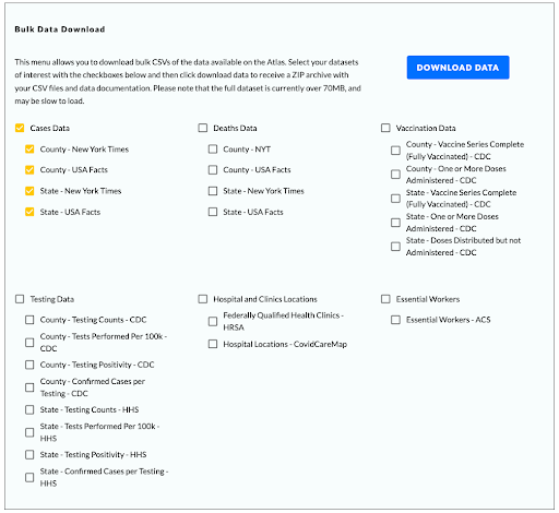 (i.e. all Cases Data), select a dataset by County and/or State, and/or select by Data Source