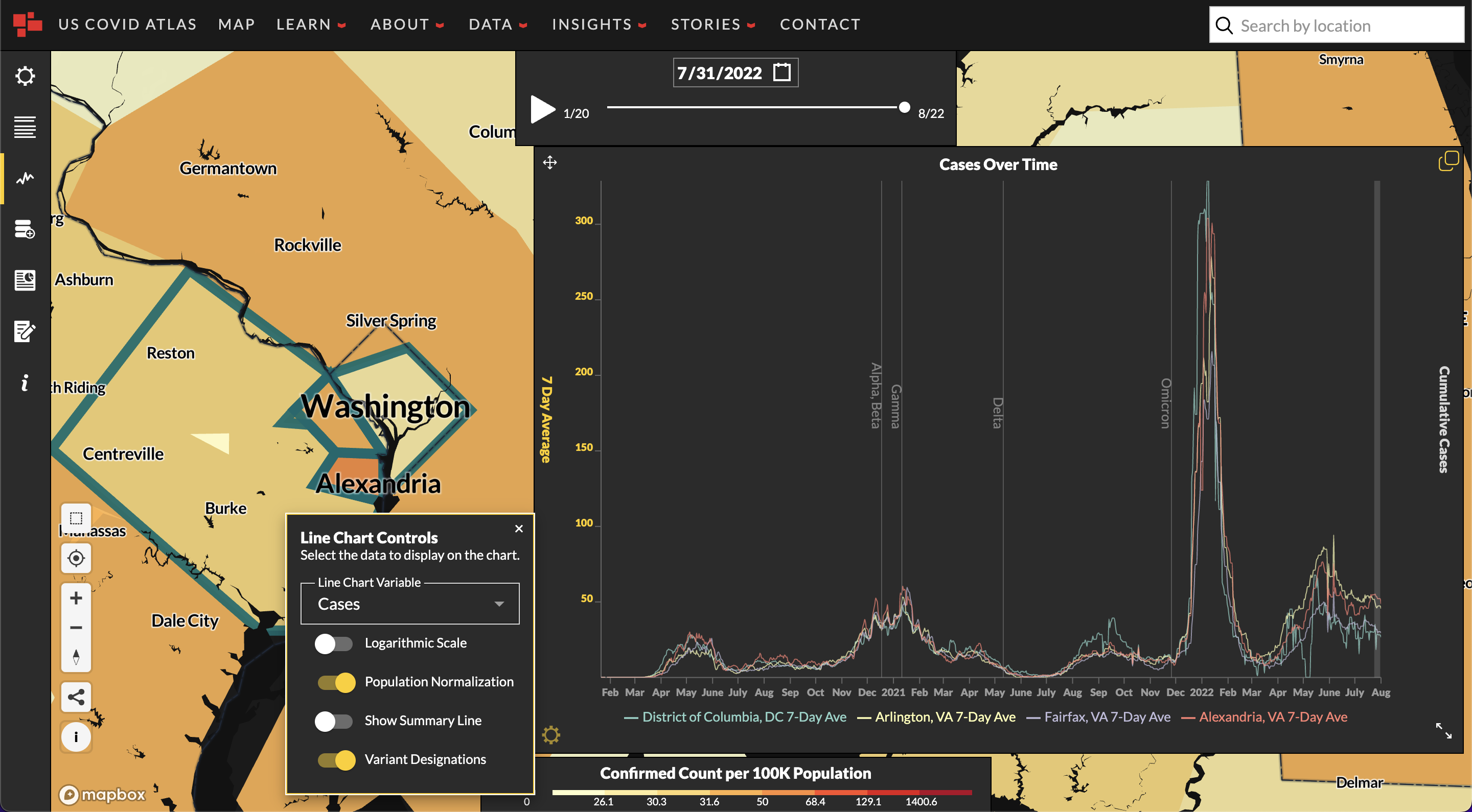 Using the arrows icon in the bottom right hand corner , expand the Line Chart window for a better view of the data. Click on a county to visualize county-specific COVID trends or leave counties unselected for a national overview of historical case data.